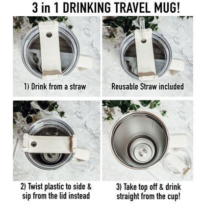 With a mug that is perfect for home, the office, the car, baseball games - you name it! Use the straw to drink it, or slide the top over and sip directly through the top. Perfect handle to not lose your grip!