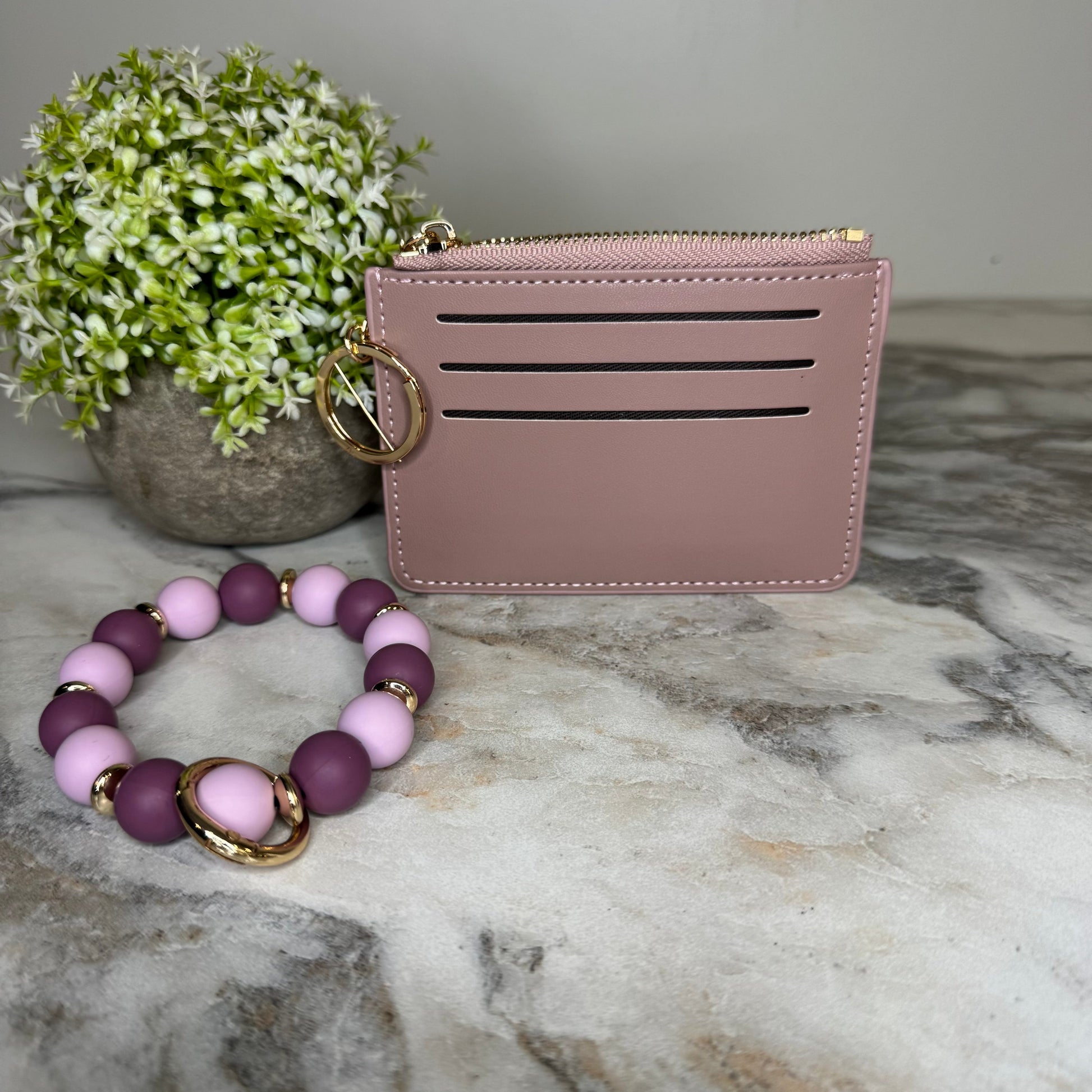 Soft silicone beads pair with gold keychain! Thick, stretchy cord allows for it to slip onto your wrist. About 3” opening, but stretches for any wrist size.