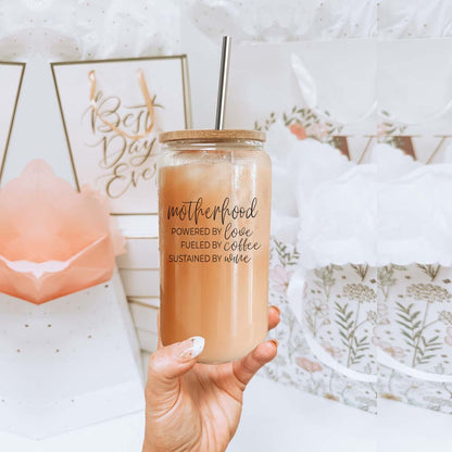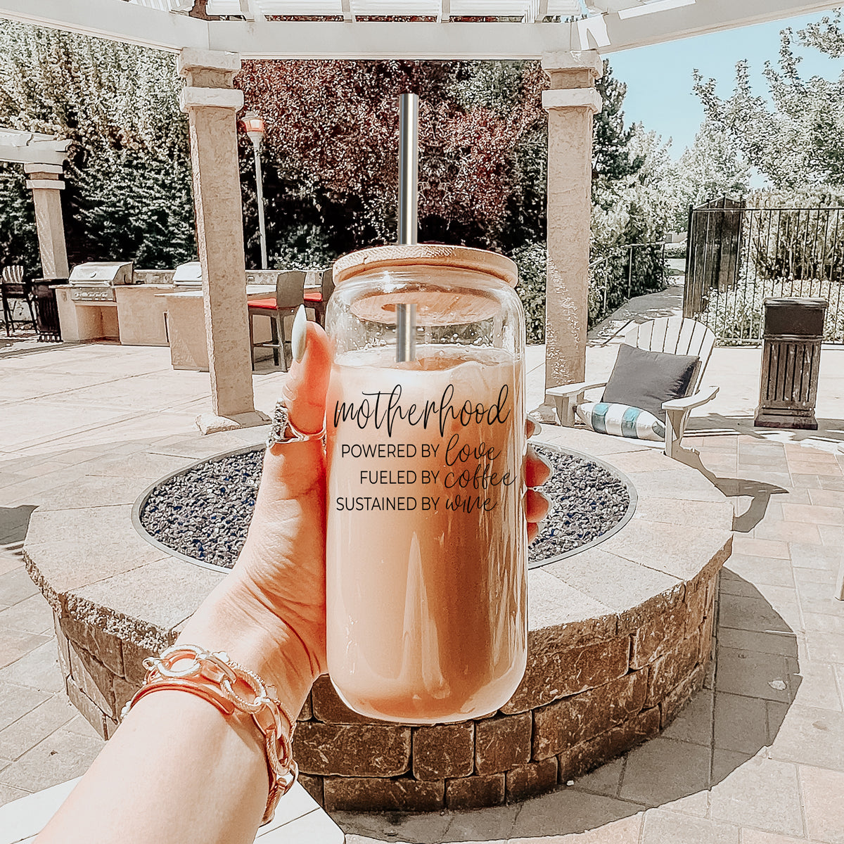 Our glasses with bamboo tops. Drink it with the top and straw of choice, remove the bamboo lid and drink straight from the glass.