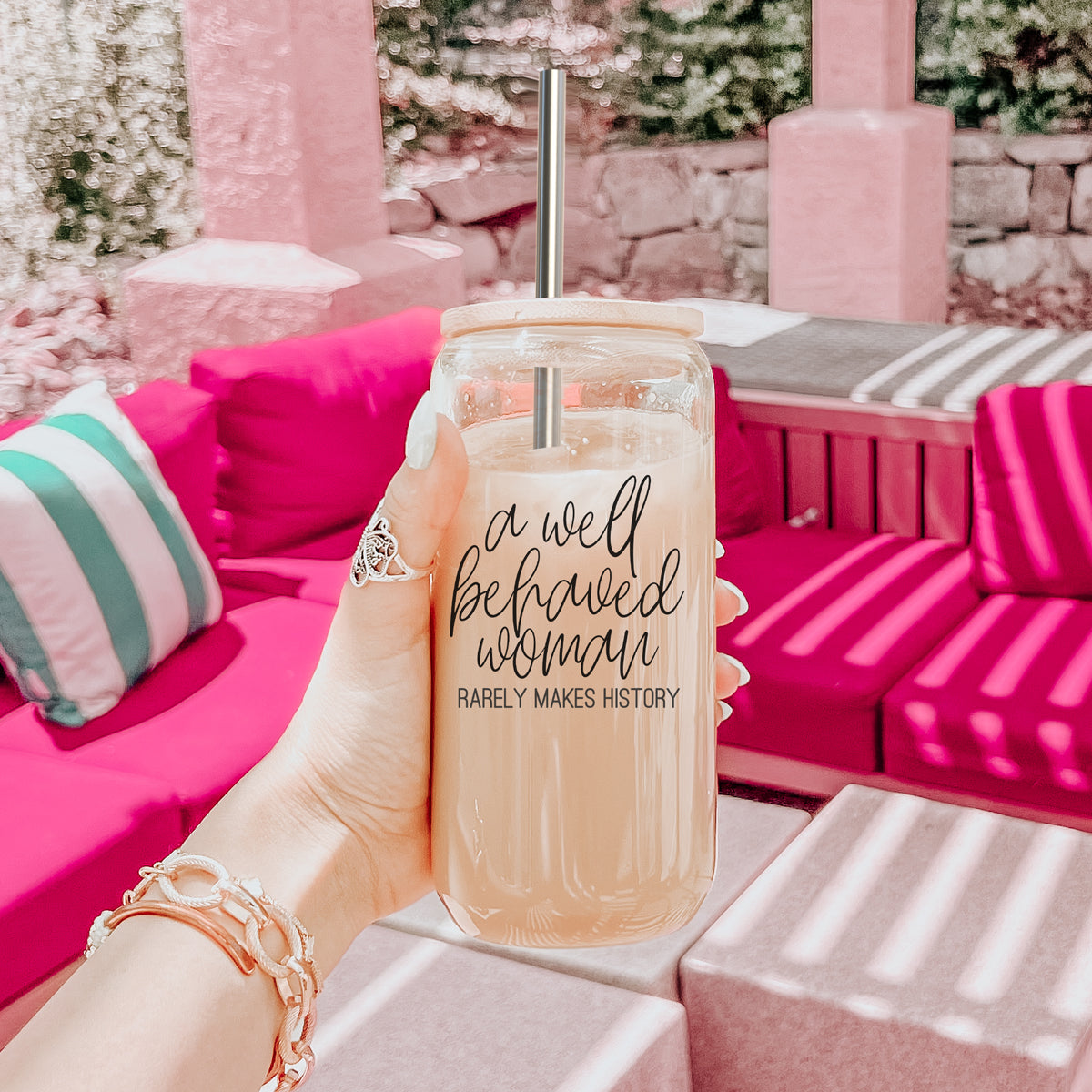 Our glasses with bamboo tops. Drink it with the top and straw of choice, remove the bamboo lid and drink straight from the glass.