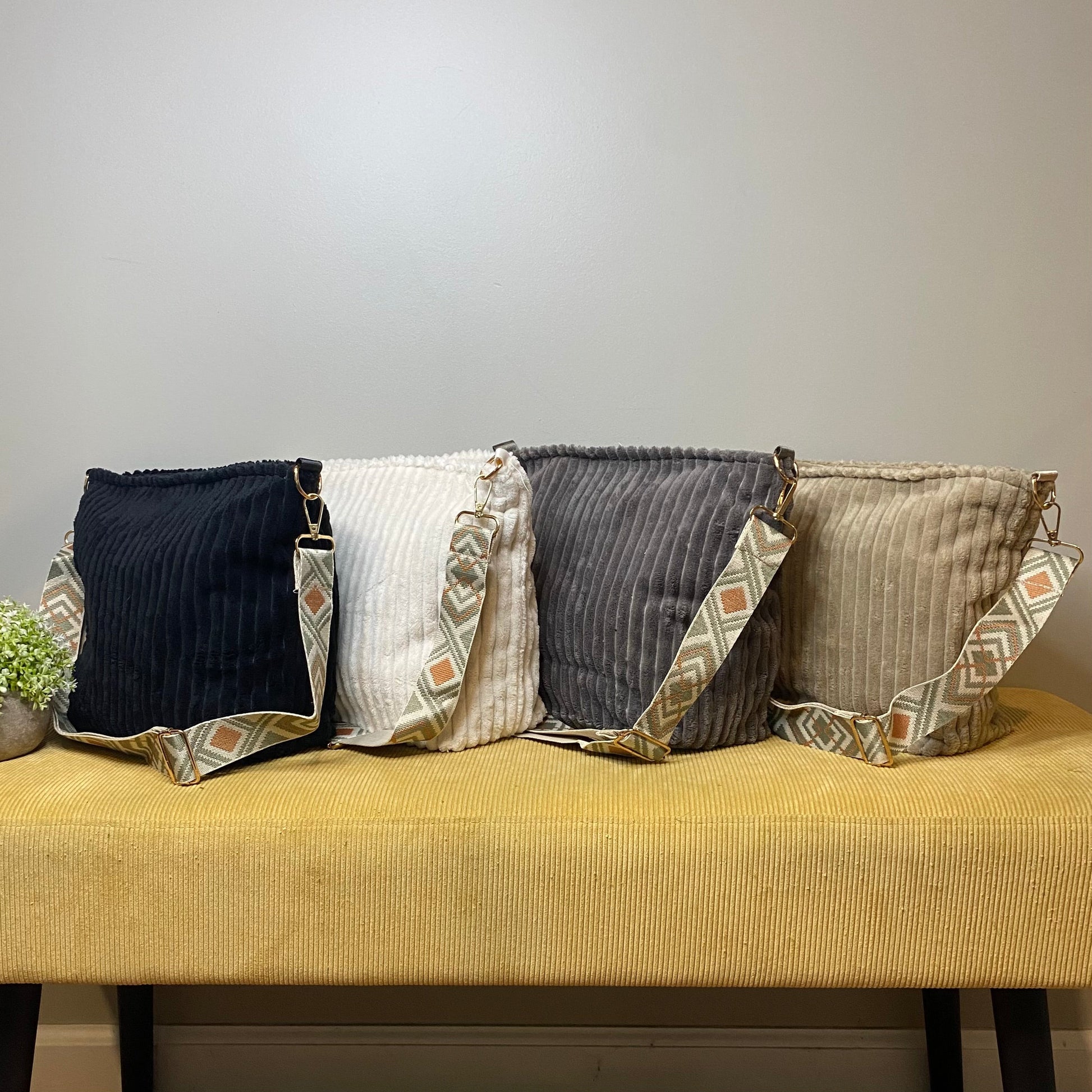 These feature 1 main zip compartment for securely storing items! Make it a purse, book bag, diaper bag, and so much more. It comes with a removable, pattern strap!