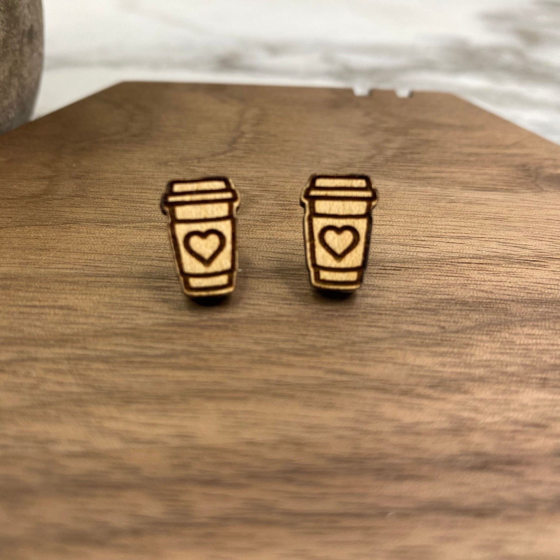 Wooden Stud Earrings - Coffee Cup Heart #2